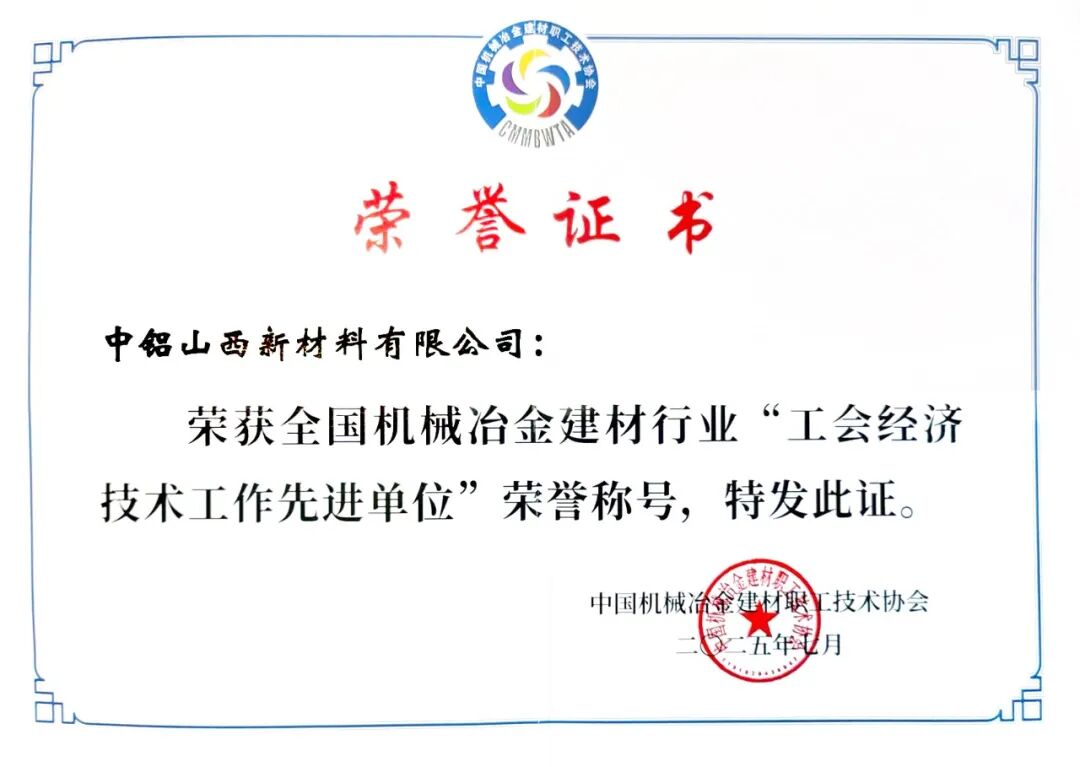 近日,从全国机械冶金建材行业工会传来喜讯,中铝山西新材料工会推荐申报项目全部荣获表彰。