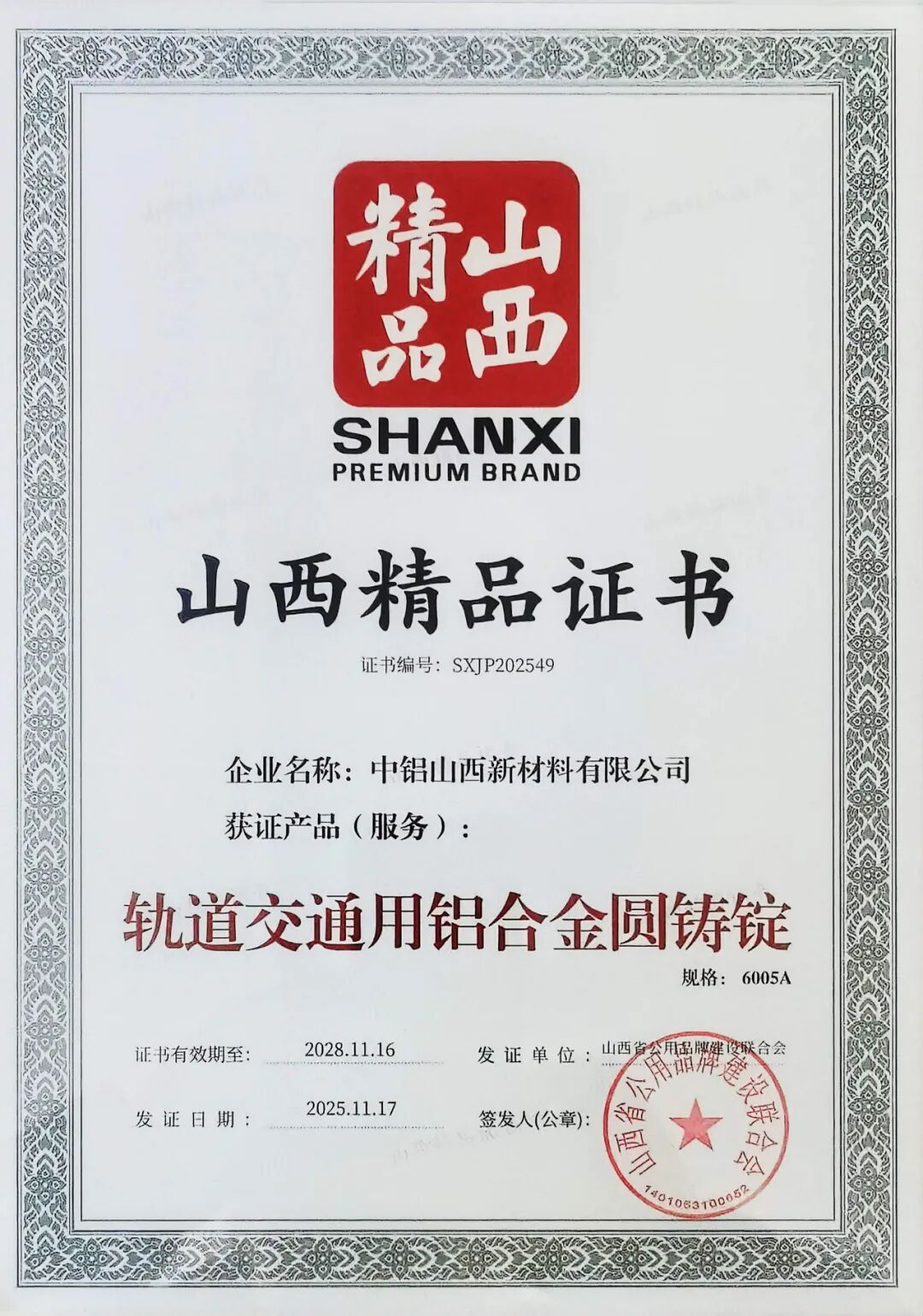 11月27日,2025年“山西精品”授牌仪式在山西广播电视台演播厅举行。中铝山西新材料自主研发生产的“轨道交通用6005a铝合金圆铸锭”凭借卓越品质与技术优势,成功通过该项认证。